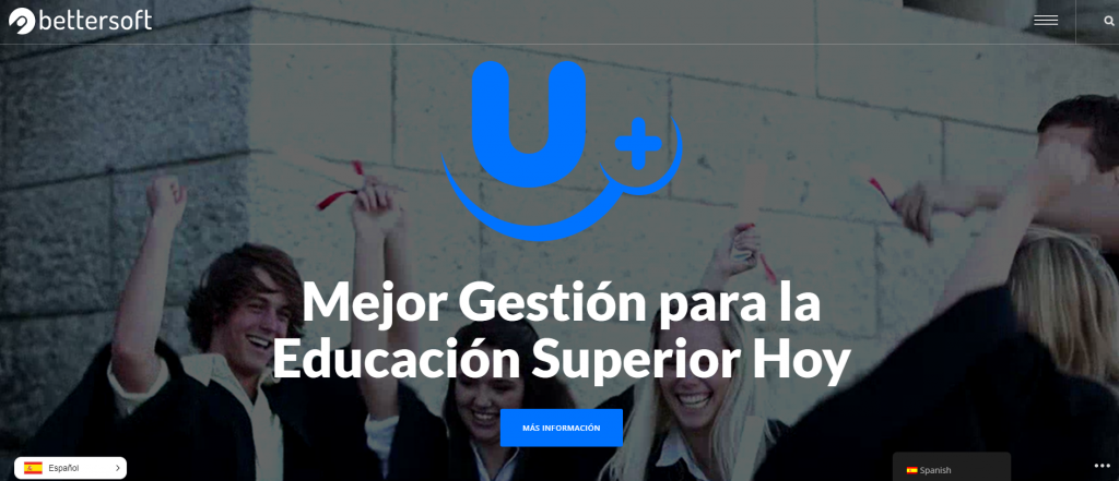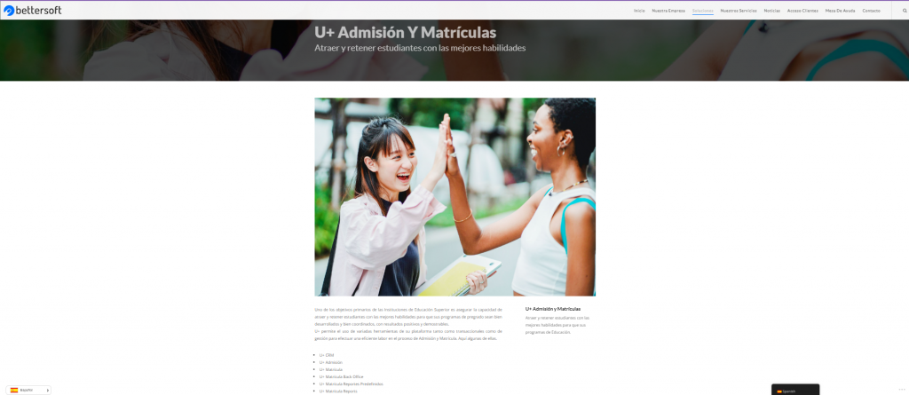 Esta web corporativa, considera 8 secciones en el menú principal, de donde destaca la sección en que se describen cada una de las soluciones de negocio para la educación superior que ofrece bettersoft.